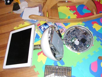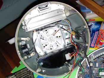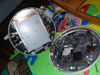 こいつに最初から入っていたものは、40ギガで画像などを取り込んでいるとあっという間にいっぱいになってしまいます。それで、160GBのものと交換することに。楽しみなのは、この半球状のボディの中身がどうなっているか。色々工夫しているのでしょうね。 開けてみると、底面にマザーボードがありました。写真で見えている右側のもの。当たり前ですが円形です。普通はここまで開けると保証が切れます。無線ランカードや増設メモリーはこの裏側の簡単に開けられる面にスロットが付いています。 さて、本体側の真ん中のはCDドライブです。電源とハードディスクとファンはどこにあるのか?ネジを思いつくままはずしていくと、ドライブが取れてその奥に、ファンと、球面に張り付くように電源トランスがありました。コンパクトです。 そして、目的のハードディスクは、なんとCDドライブの上に子亀のようにオンブしていました。笑っちゃう。 |