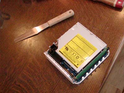 本体とカバーの間にヘラを差し込み,端から順にこじ開けていきます.すると写真のように本体が浮き上がります.鈎のようになっていてそれで止めてあるわけですね.きずをつけないように.