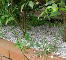 ◇石をしく 一部、石も敷いてみました。結果、案外いいかも。 私はまたもやケチって、5センチ厚ぐらいで敷いたのですが、地下茎の草はたくましく出てきました。草が目立つのですぐ抜く気になります。種からの草は今のところ生えてませんね。 そうそう、石の下にアスファルトのシートを敷くと完ぺき除草、という商品がありますが、スギナのようなどう猛な草は、シートを突き破って生えてきます。業者に騙されないように。それに通気がなくなるから土がおかしくなっちゃうんじゃないかなぁ。 それから、石のもうひとつの問題点は、木に固形肥料をやれないということですね。液肥オンリー。実のなる木は栄養が偏るかも。 |